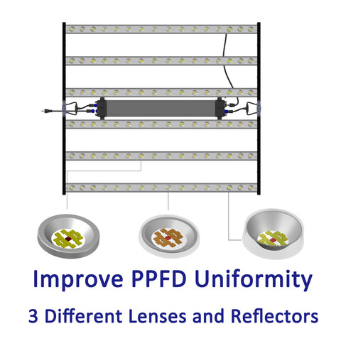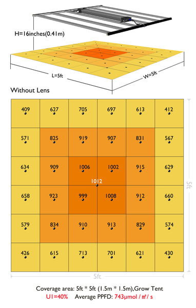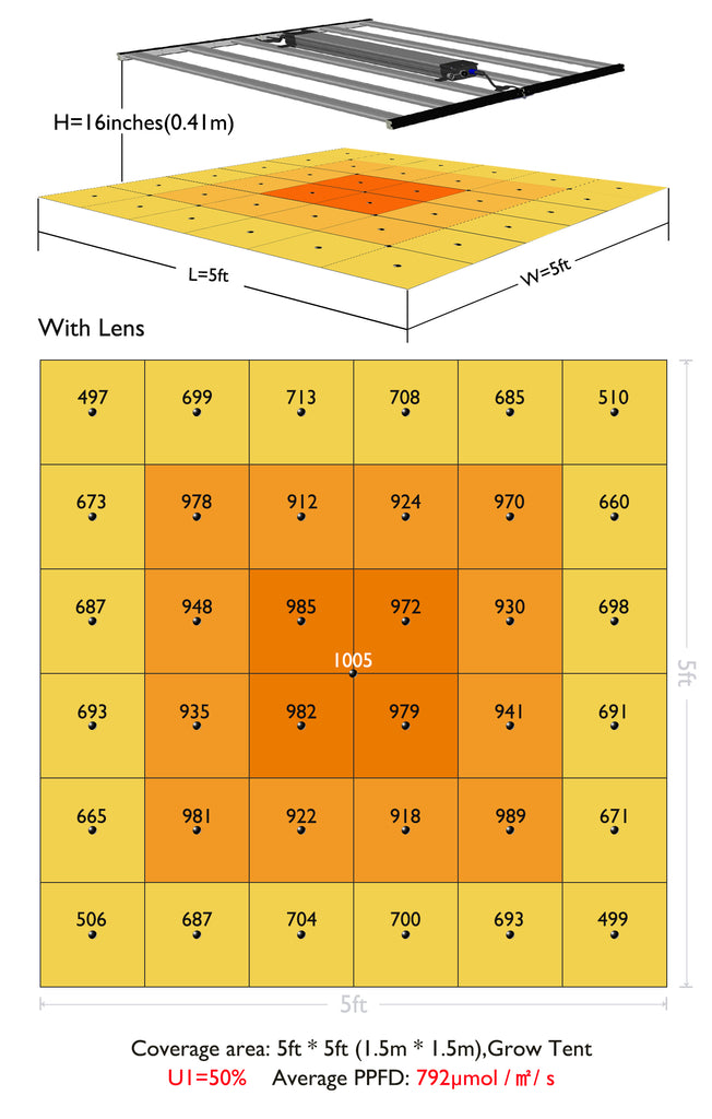 The foldable plant light optimized with 3 different lens reflectors has a 34% increase in uniformity and an average PPFD increase of 14% compared to the non-lens product (tested in a dark room without reflection, the suspension height is 16” (0.41m), 5ft*5ft(1.5x1 .5m) coverage area, 81 points test.